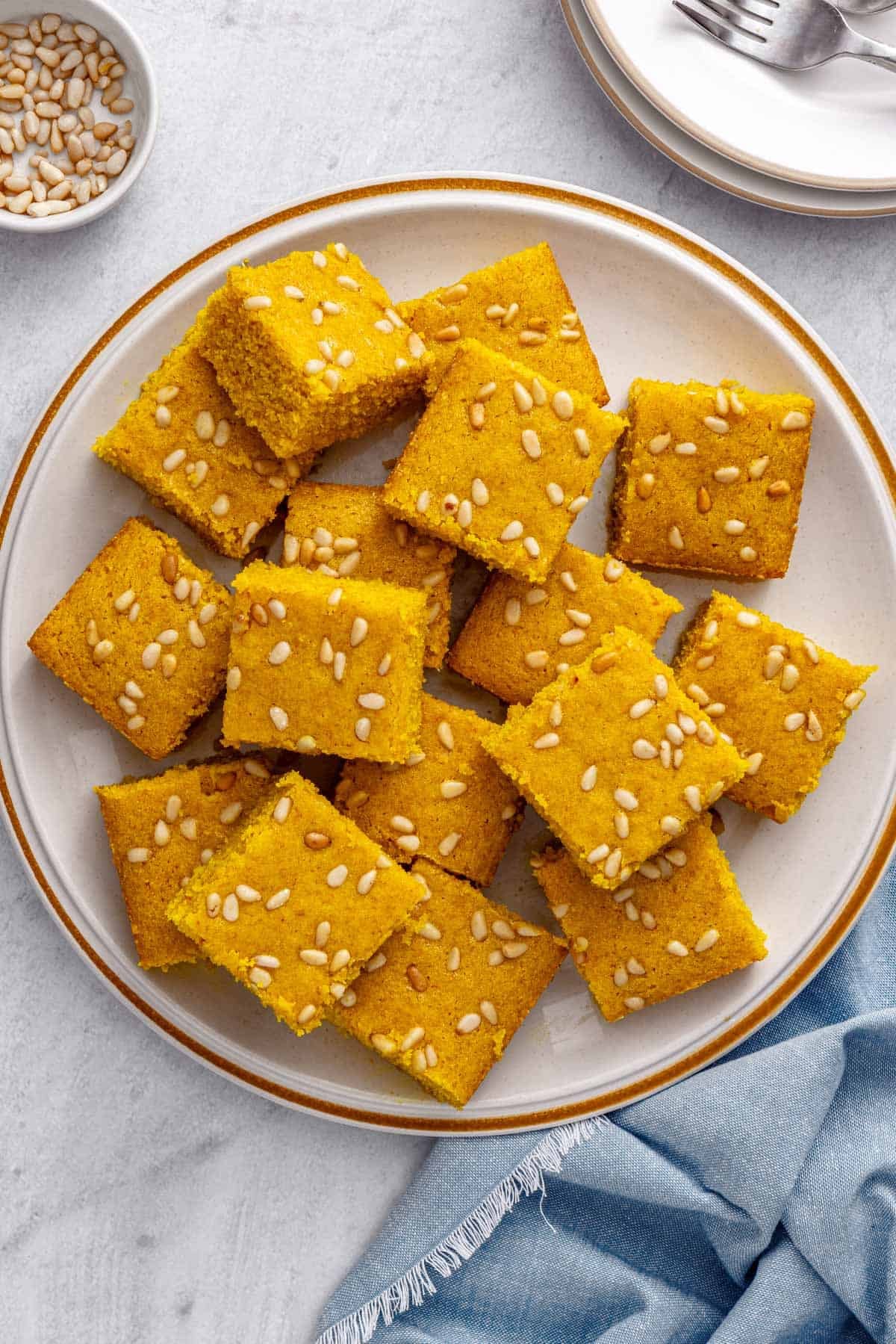 - Watch the pine nuts closely. The sfouf should look set and lightly golden on top, but the pine nuts can go from golden to too dark fast near the end of baking.