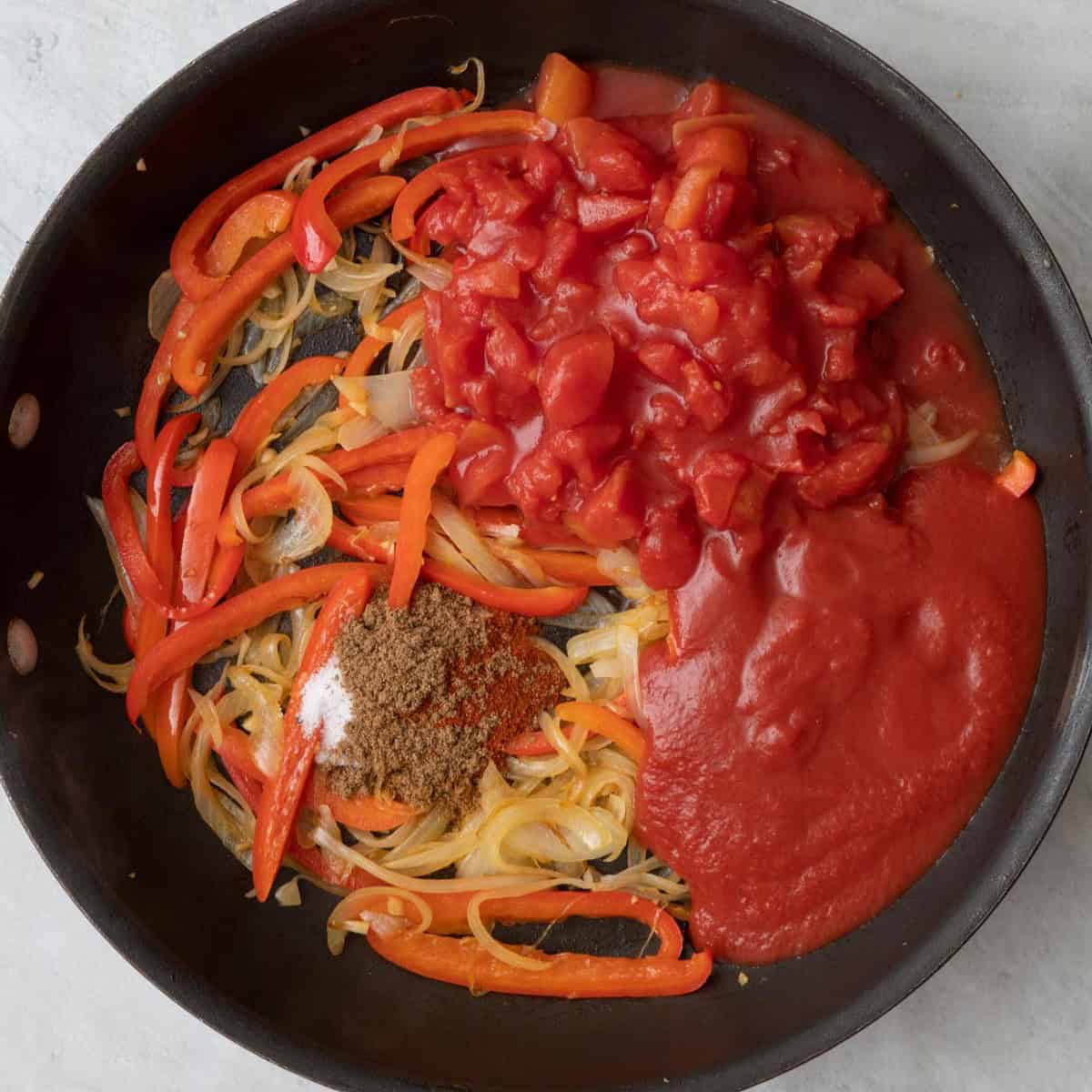 - Pour in the tomatoes and tomato sauce, and add cumin, paprika and coriander. Season with salt and pepper. Bring to a boil, then reduce heat to low and simmer until the tomato sauce thickens like a stew, about 10-15 minutes.