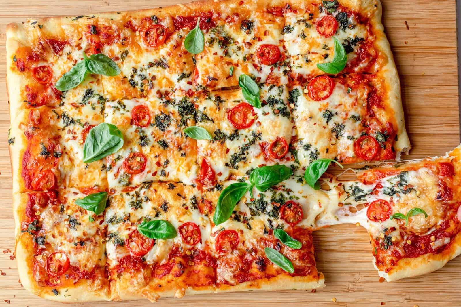- Toppings: You can do any toppings you want for your sheet pan pizza! I like to make a margarita-style pizza with cherry tomatoes and fresh basil. I do add crushed red pepper flakes for some heat, but totally optional.