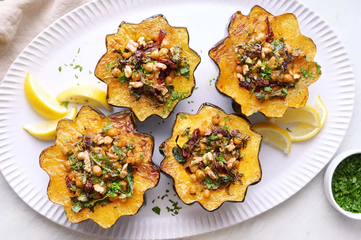 Stuffed acorn squash made with chickpeas, sun-dried tomatoes, spinach, and walnut meat. With only 20 minutes of prep time, the oven does the rest.