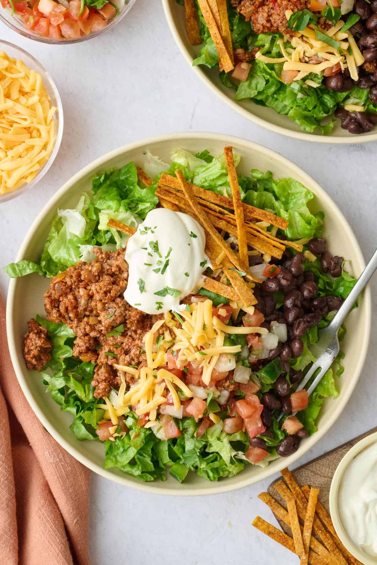 - For assembly: I like to start with a base of chopped romaine lettuce in each taco salad. After I add the taco meat, I like to add pico de gallo, black beans, sour cream, and tortilla strips. Don’t forget the shredded cheese! Cheddar, Mexican blend, or Monterey Jack are great options. This recipe is very versatile, so what goes in the taco salad is up to you!