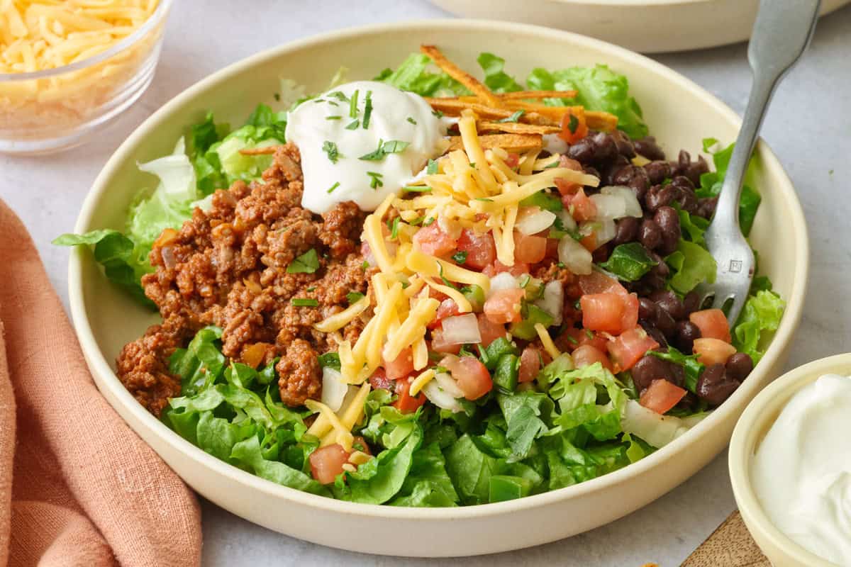 It’s basically everything I’d put in tacos anyway: seasoned ground beef, lettuce, cheese, pico de gallo, black beans, and a little sour cream. The only difference is that this taco salad all goes in a bowl and gets served with tortilla strips or scooped up with tortilla strips. Same flavors, way less effort.