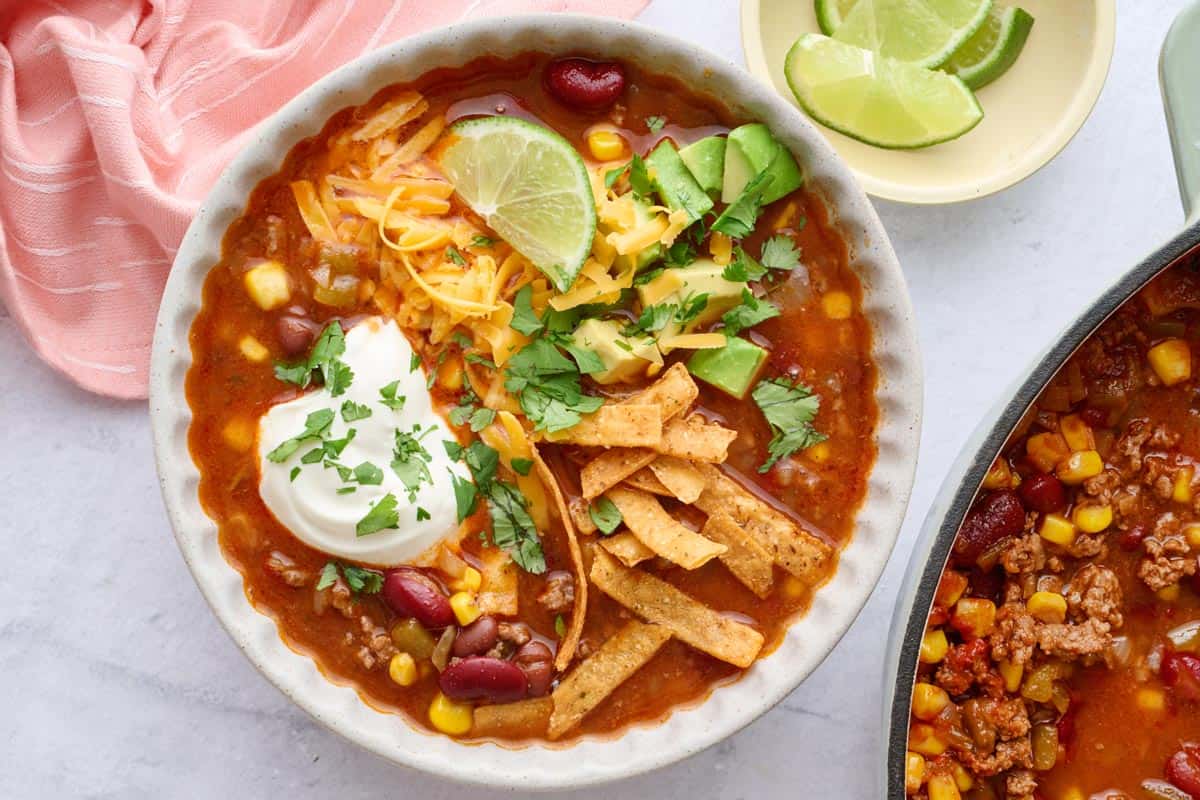 One-pot taco soup made with pantry staples, ground beef, beans, and taco seasoning, finished with fresh lime juice.