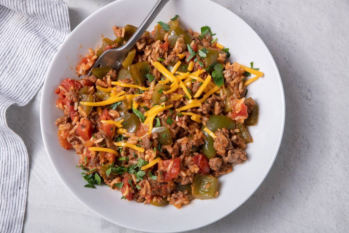 This one-pan unstuffed peppers recipe combines beef, rice, bell peppers, and tomatoes for a simple weeknight dinner.