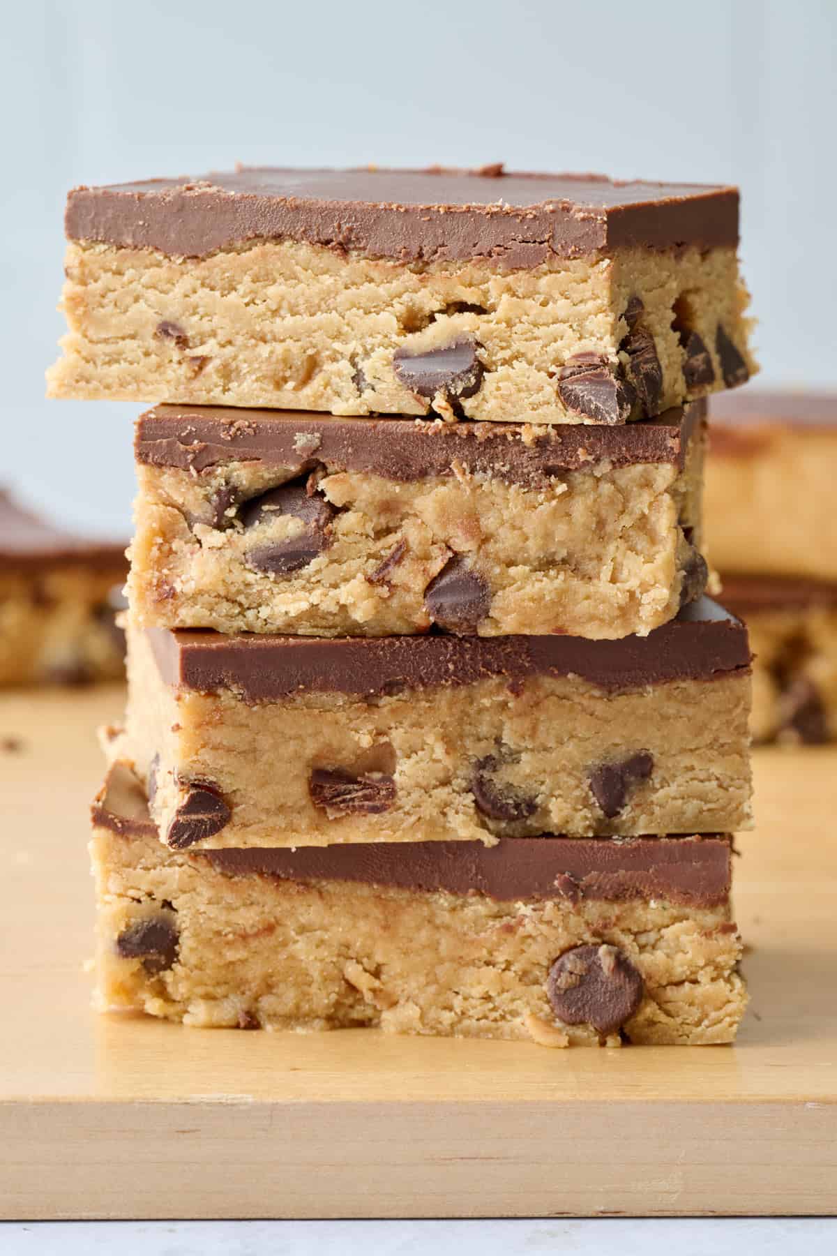 I was pleasantly surprised by these cookie dough bars! I was looking for a snack for my teen daughter to take to school, and we were both a little bit skeptical of this recipe. We thought that the peanut butter taste would be overpowering. We were completely wrong! These bars are the perfect snack, and they actually taste pretty similar to actual cookie dough.
