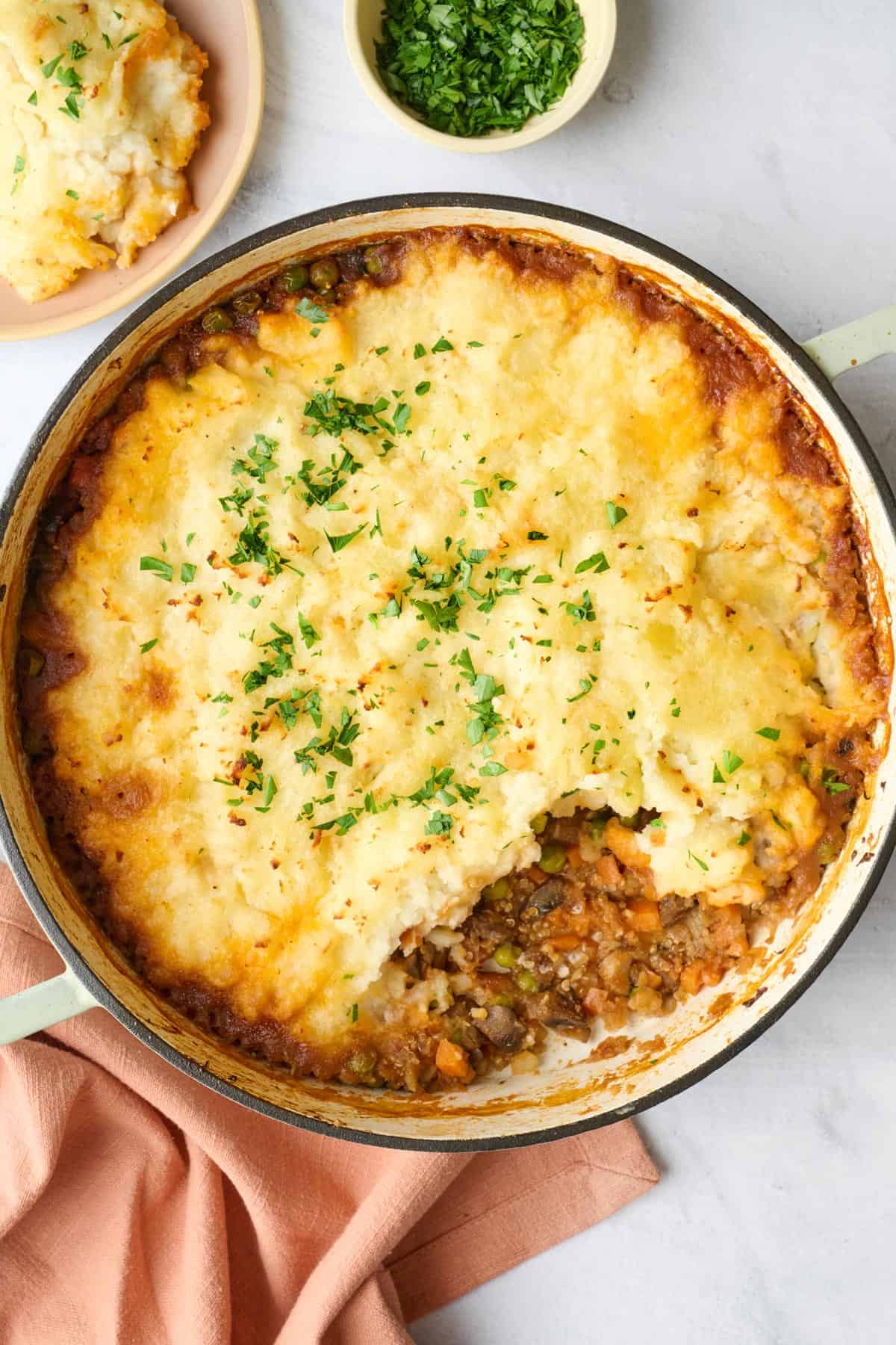 After baking, let the dish cool completely, then cover it tightly with foil. You can freeze the pie for up to 3 months and cook it straight from frozen, keeping it covered with the foil and cooking for an hour at 350ºF. If you’re freezing it, I would recommend baking the shepherd’s pie in a casserole dish.