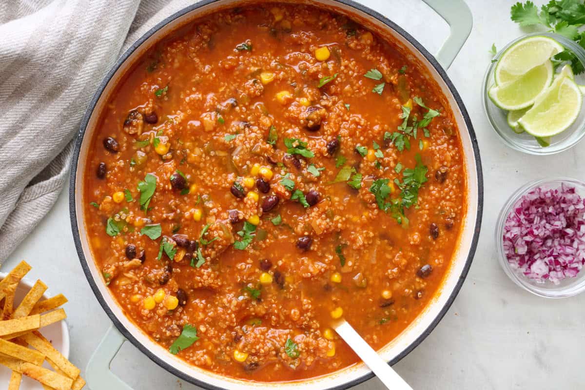 I like soup in the winter, but it has to actually keep me full, or I’m not interested. This vegetarian tortilla soup does that by swapping the chicken for quinoa, which makes it feel more like a meal than just a bowl of broth. It has the same general flavor as chicken tortilla soup: tomatoes, spices, beans, corn, and crunchy tortilla strips, just without the meat. I make this vegetarian tortilla soup a lot for Meatless Monday, or anytime I want soup that doesn’t leave me hungry an hour later.