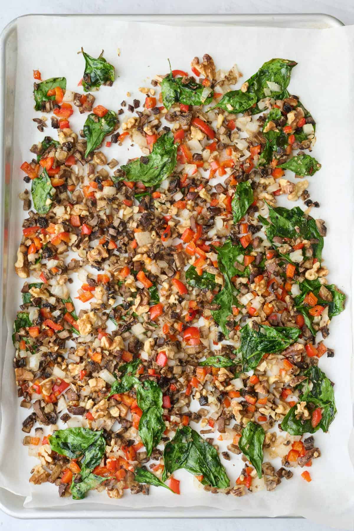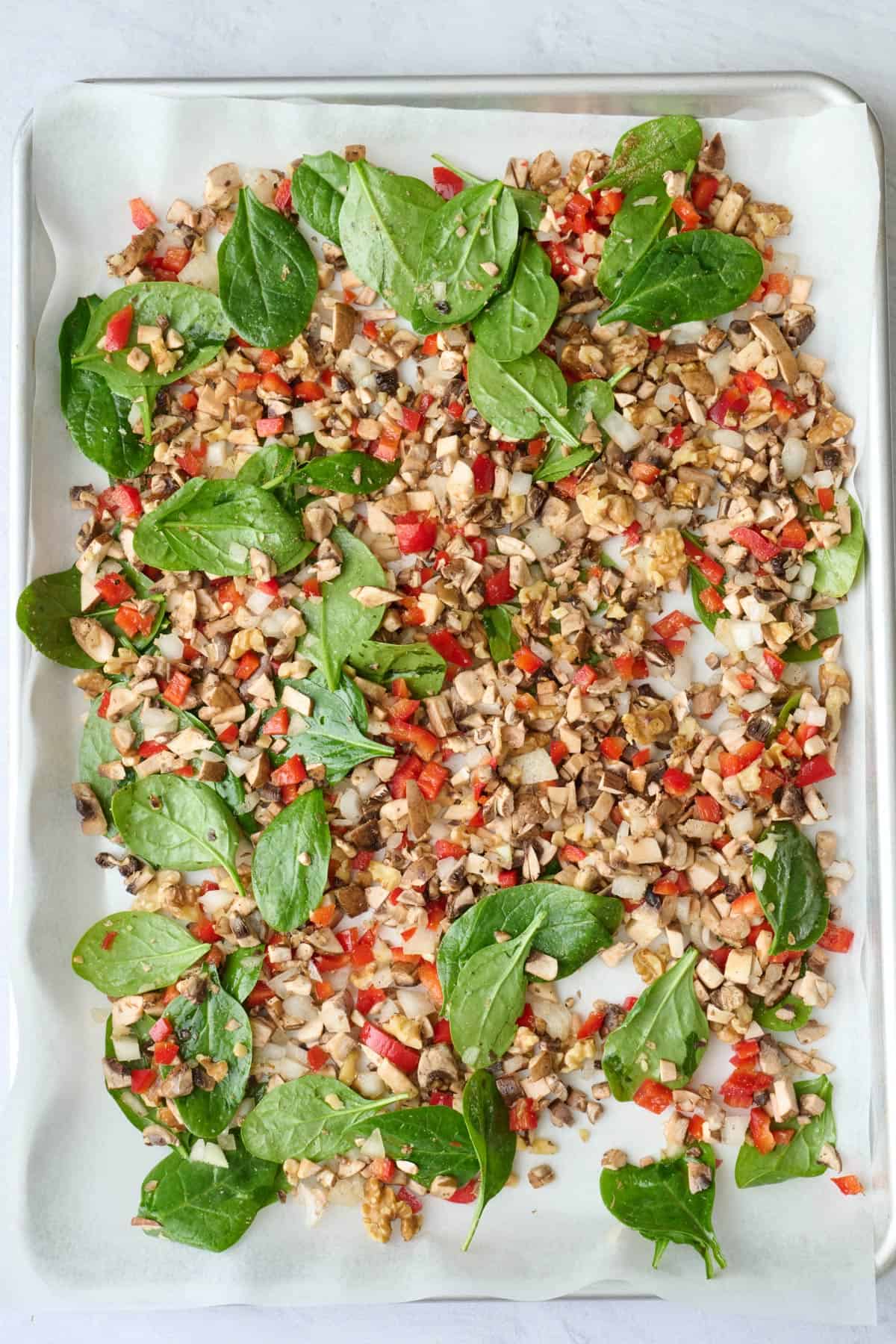 - Preheat the oven to 400°F. Line two sheet pans with parchment paper. Spread the black beans on one pan. On the second pan, add the mushrooms, red pepper, spinach, onion, and walnuts. Drizzle with 1 tablespoon olive oil, then sprinkle with salt, pepper, coriander, and garlic powder. Toss to coat.