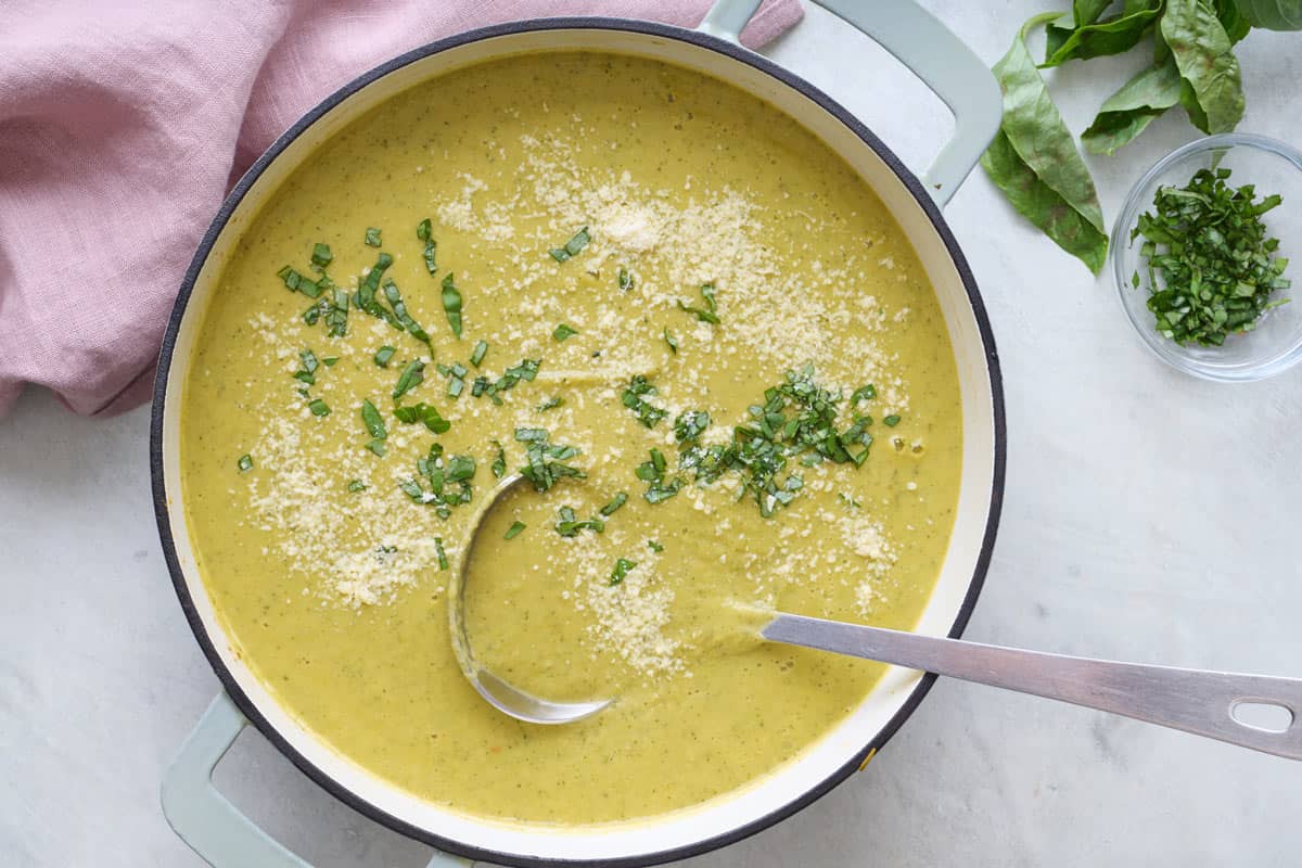 This Zucchini Soup is oh-so-creamy, thanks to the cannellini beans, and deliciously seasoned with a little cheesiness from the parmesan.